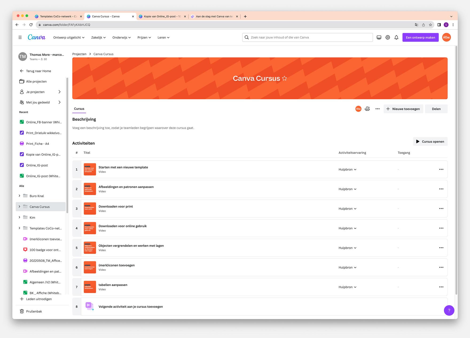 Dit verduurzaamden we in een online cursus die plaatsten in -hoe kan het ook anders- Canva! Hoe tekst en afbeeldingen aanpassen, hoe templates gebruiken, hoe exporteren voor web of print, enzovoort. Netjes opgedeeld in verschillende overzichtelijke hoofdstukken zodat de video’s in een logische volgorde staan en gemakkelijk bijgewerkt kunnen worden.