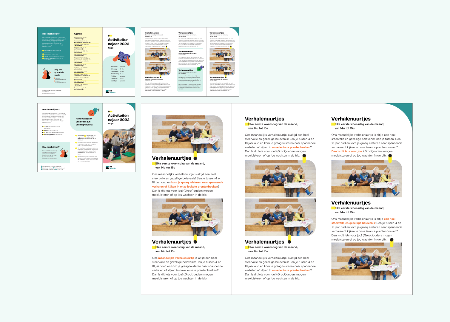 Om de activiteiten in de verschillende bibliotheken overzichtelijk op te sommen ontwikkelden we een drieluik plooifolder. De medewerkers van de bib kunnen de inhoud makkelijk zelf aanpassen in Canva en voor extra variatie kunnen ze kiezen uit 2 verschillende lay-outs.