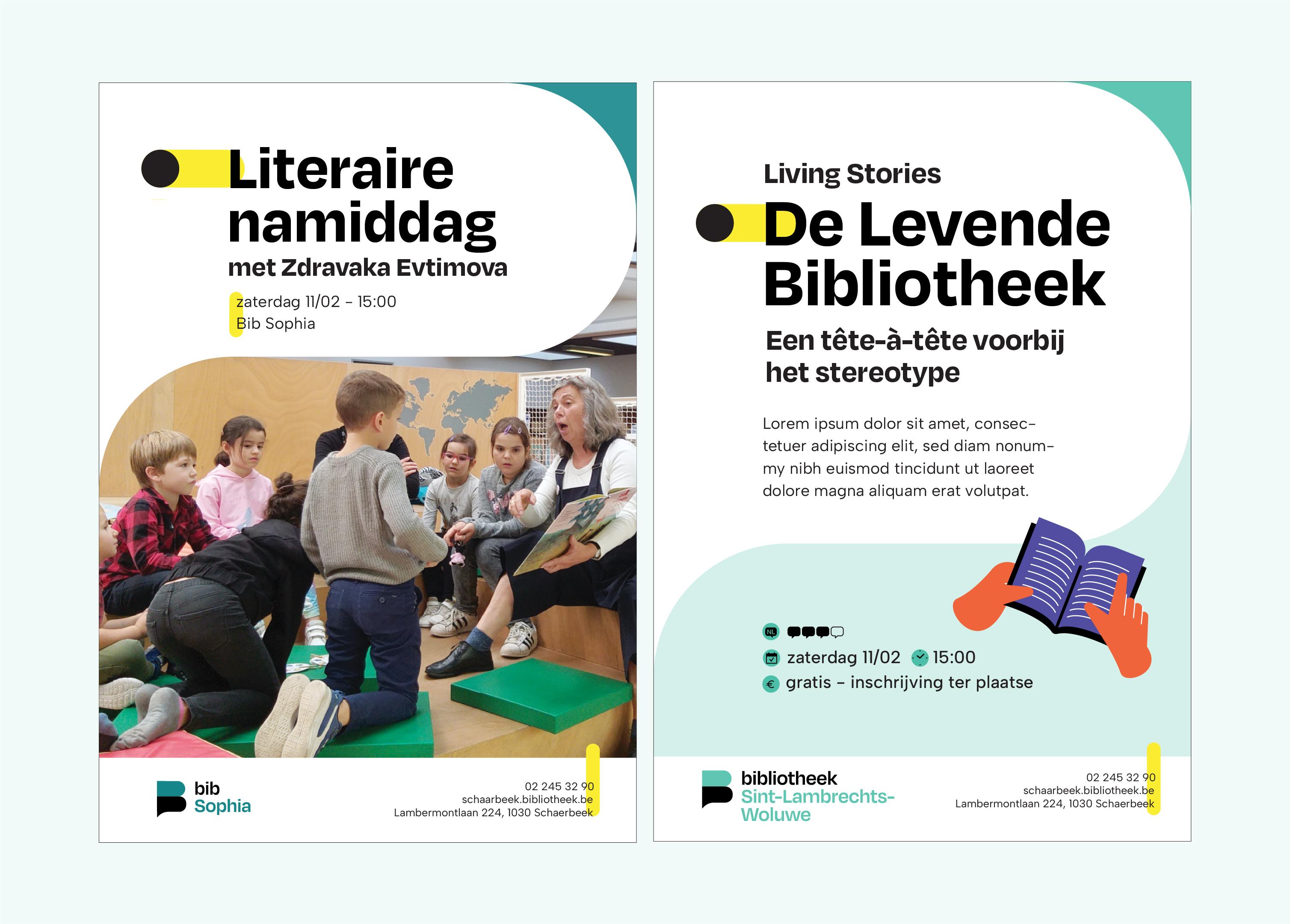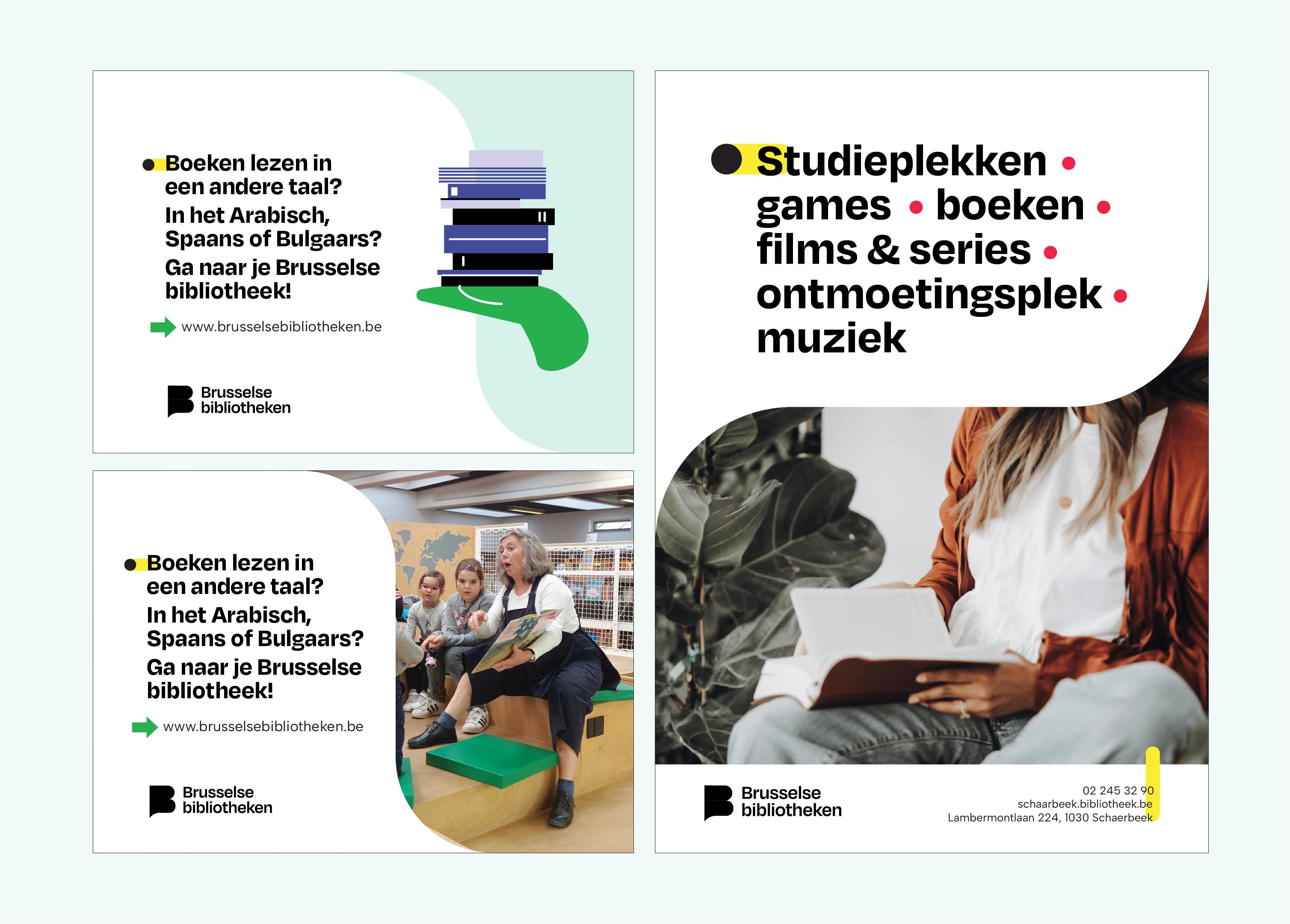 We ontwikkelden flyers, affiches, brochures, advertenties, sociale media posts, briefhoofdingen en zetten alle ontwerpen om in Canva templates waarmee de Brusselse bibliotheken zelf aan de slag kunnen.