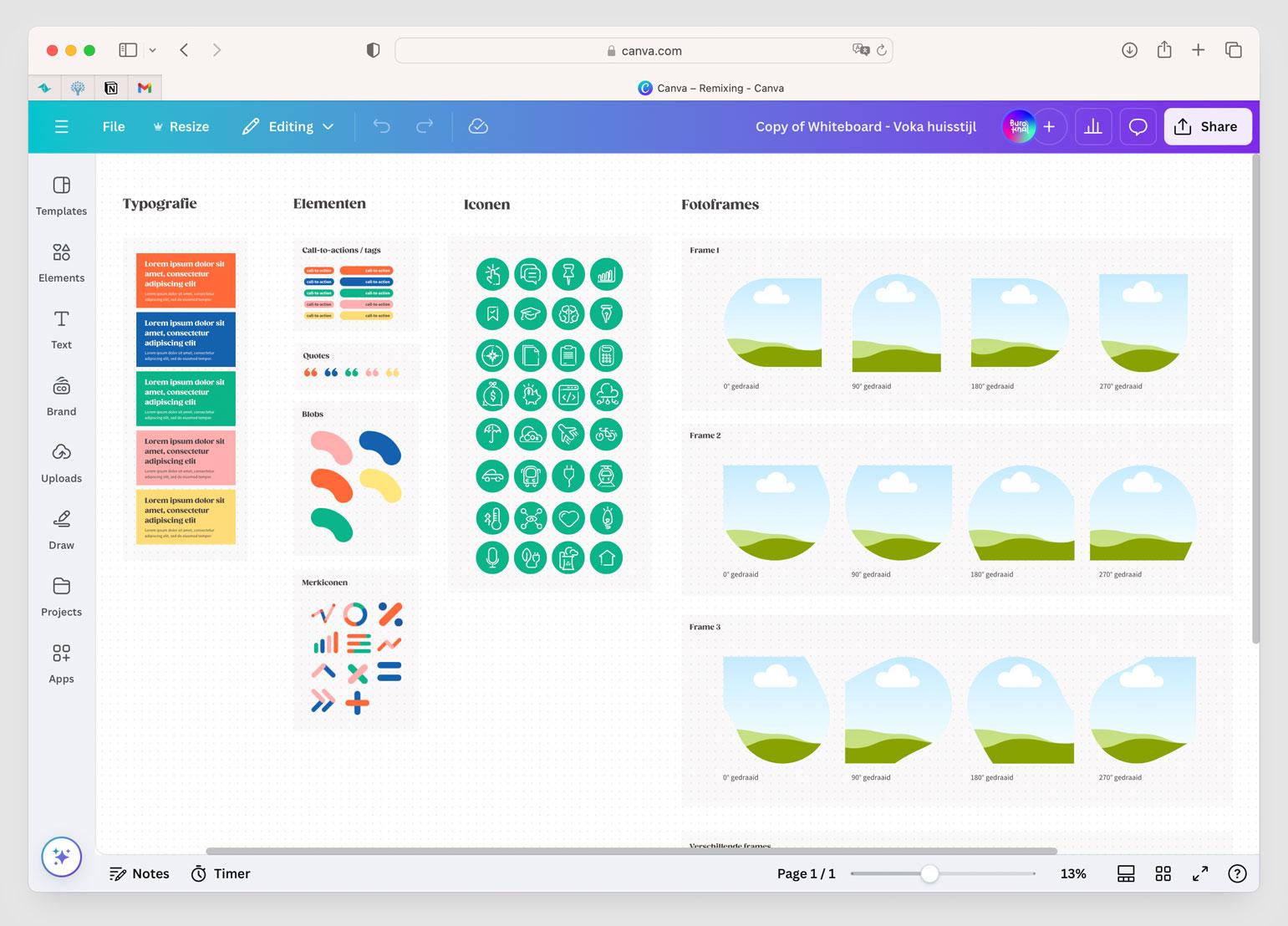 Met meerdere collega’s in Canva werken, is niet altijd gemakkelijk. Daarom bundelden we alle huisstijl elementen op een whiteboard zodat alles op één plek staat en makkelijk terug te vinden is. Ze kunnen de elementen daar makkelijk kopiëren en in de gekozen template plakken.