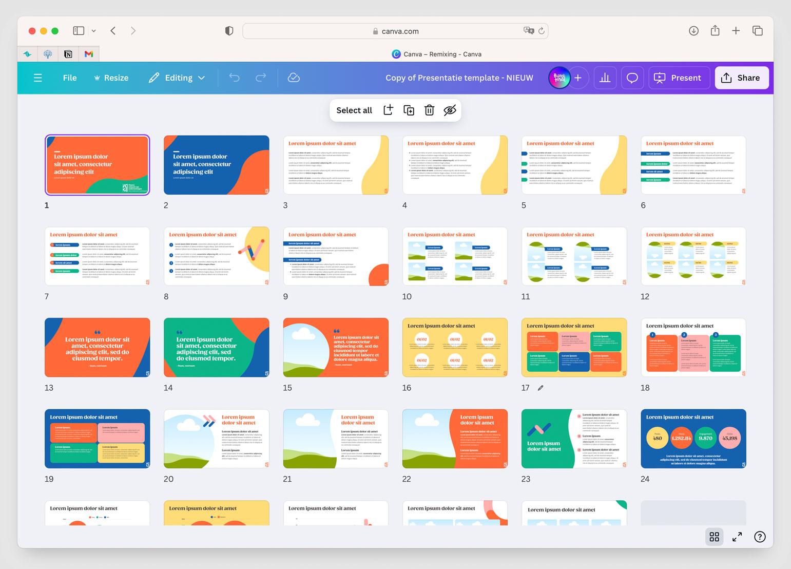 We ontwierpen ook een template voor een presentatie met 20 algemene slides. Dit zorgt ervoor dat ze ook hier de huisstijl consistent kunnen doortrekken, maar toch voldoende variatie hebben om zelf een selectie te kunnen maken uit de opgemaakte slides.