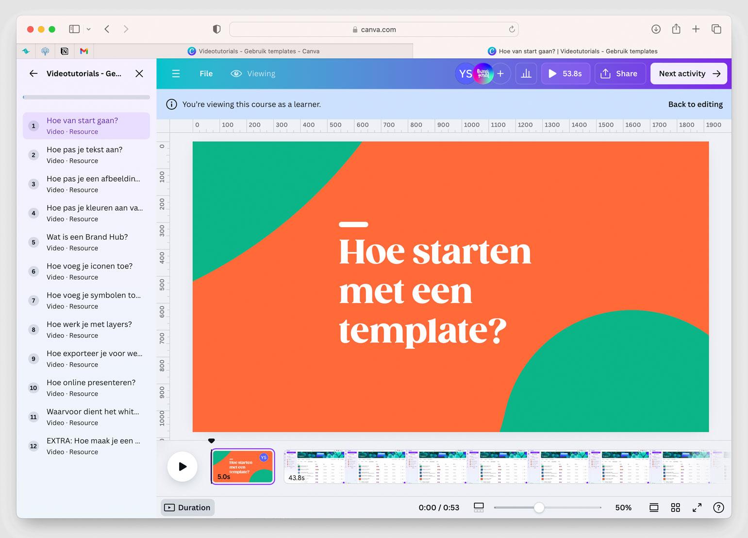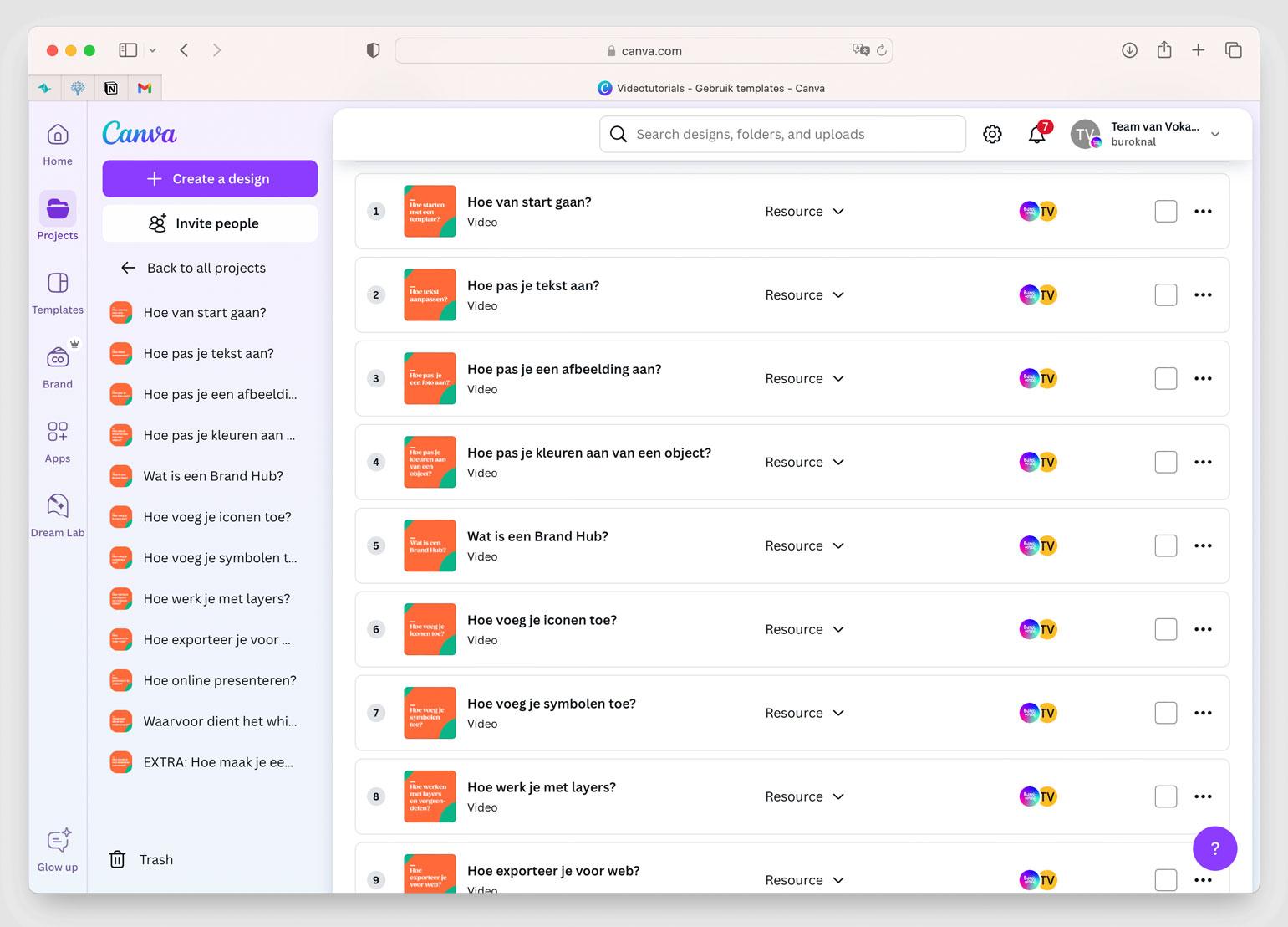 We namen een bibliotheek aan videotutorials op om de teamleden te tonen hoe ze de templates best gebruiken, hoe ze afbeeldingen moeten importeren, hoe ze teksten aanpassen, designs kunnen exporteren voor online gebruik, enzovoort. Dit zorgt ervoor dat alle medewerkers zelf het antwoord op hun vraag kunnen opzoeken en dat nieuwe medewerkers snel en makkelijk aan de slag kunnen in Canva.
