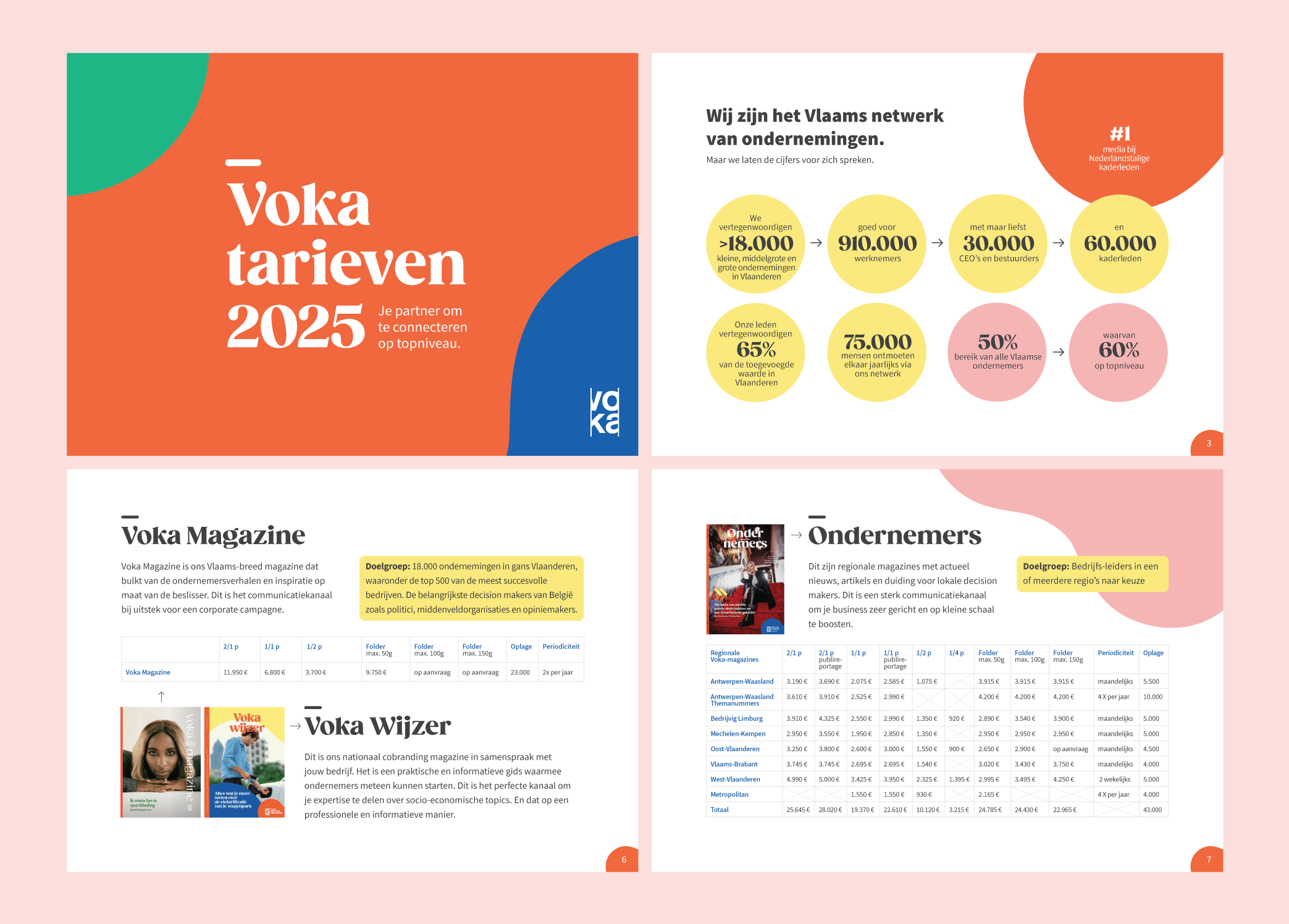 Je kan niet al je communicatiemiddelen in een Canva template gieten. Daarom maakten we een costum design salesbrochure waarin alle tarieven van Voka gebundeld staan en die uiteraard weer mooi binnen de huisstijl past.
