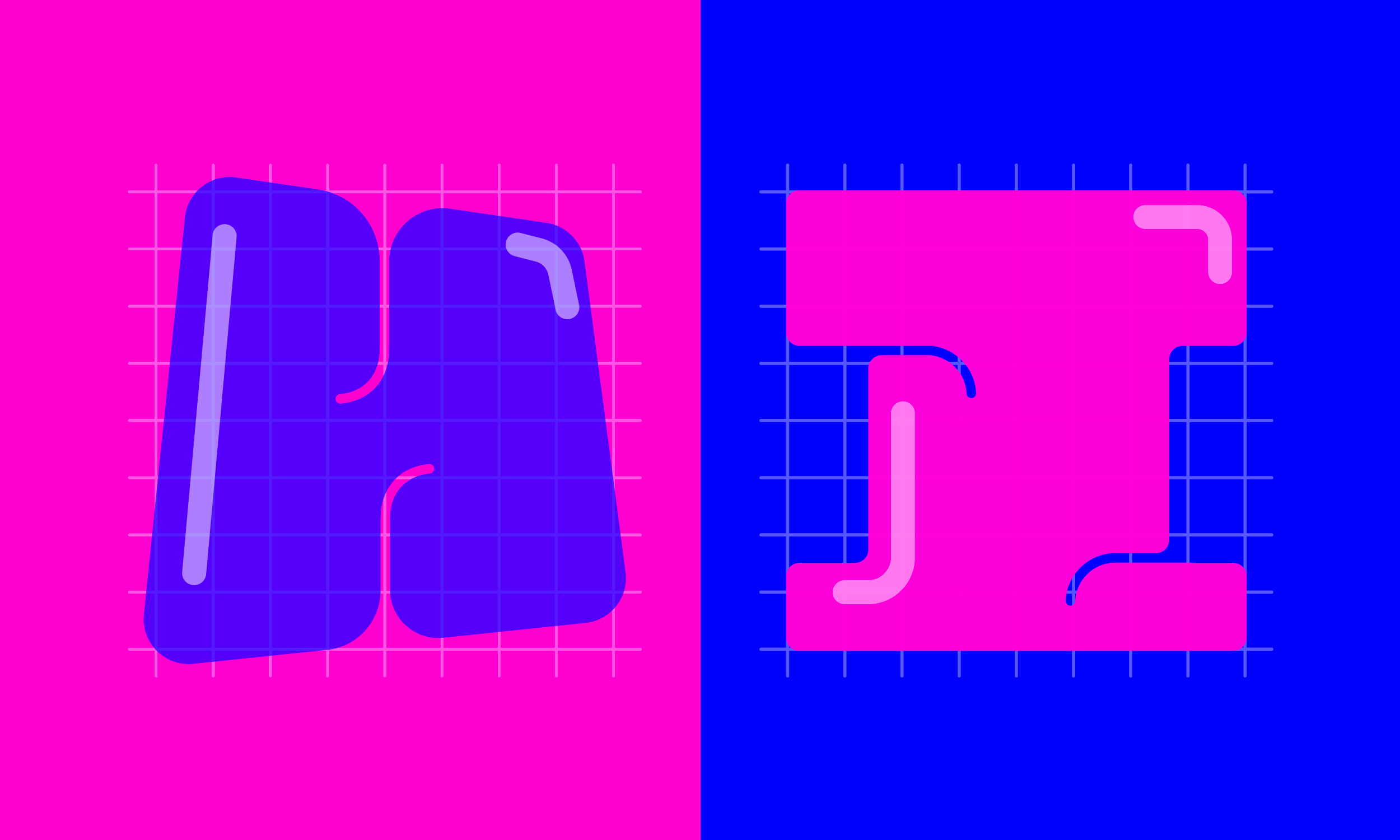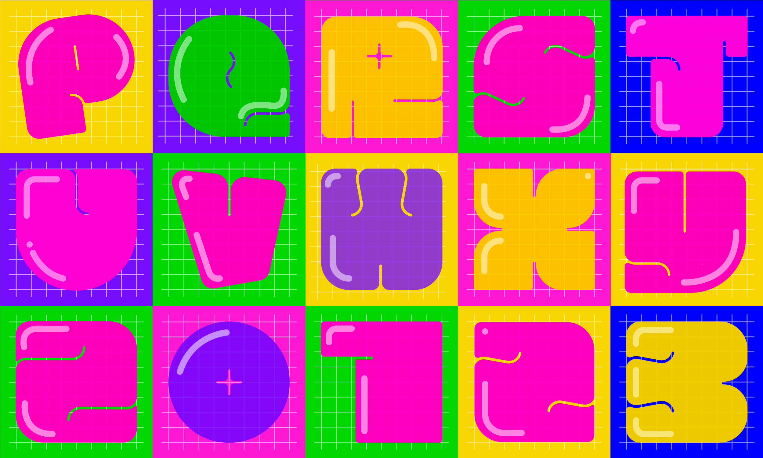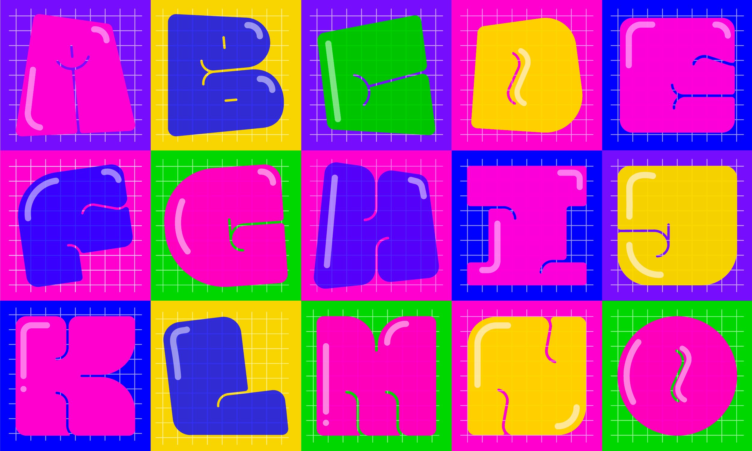De basis van de letters is simpel en strak: een vierkant met witte lijnen. Nadien werd elke letter afgerond, vervormd, geroteerd… en van een knalkleur voorzien.