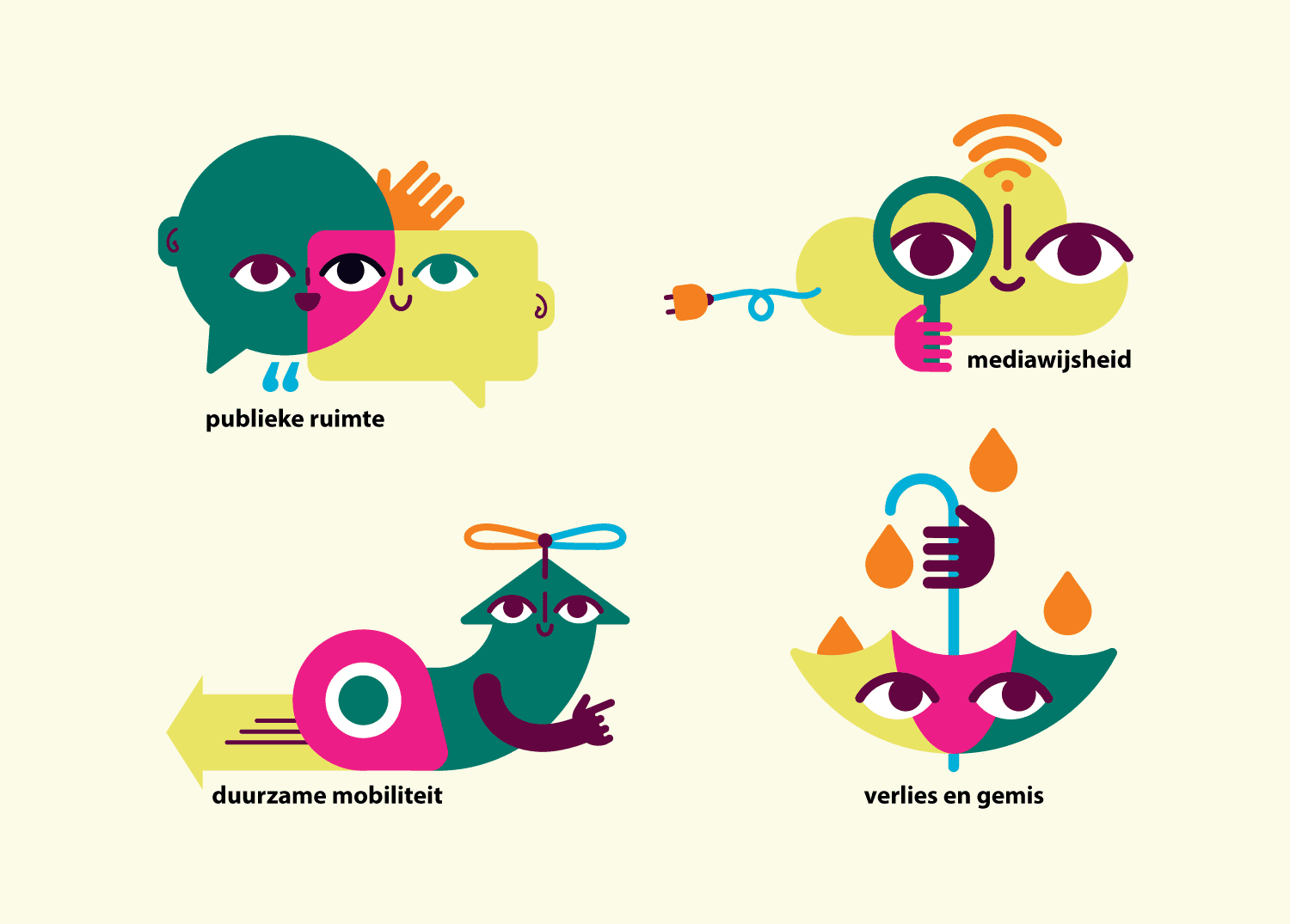 Daarnaast werkten we vier illustraties uit voor de inhoudelijke speerpunten van Avansa Rivierenland: publieke ruimte, digitalisering, duurzame mobiliteit en sociaal collectief gemis. Elk speerpunt kreeg een eigen karakter en kleur, met voldoende samenhang binnen het geheel. Zo vormen de illustraties één herkenbare familie.