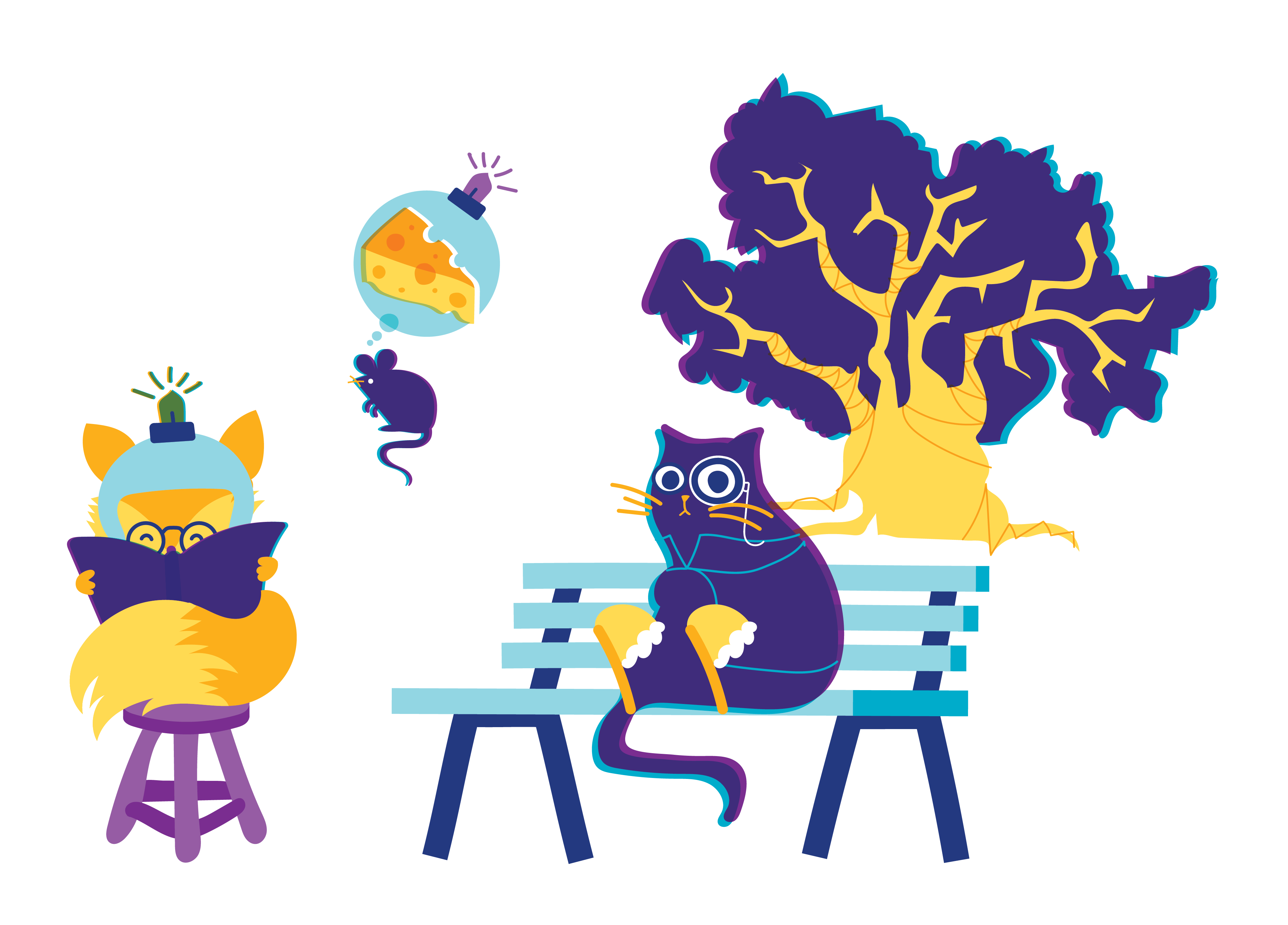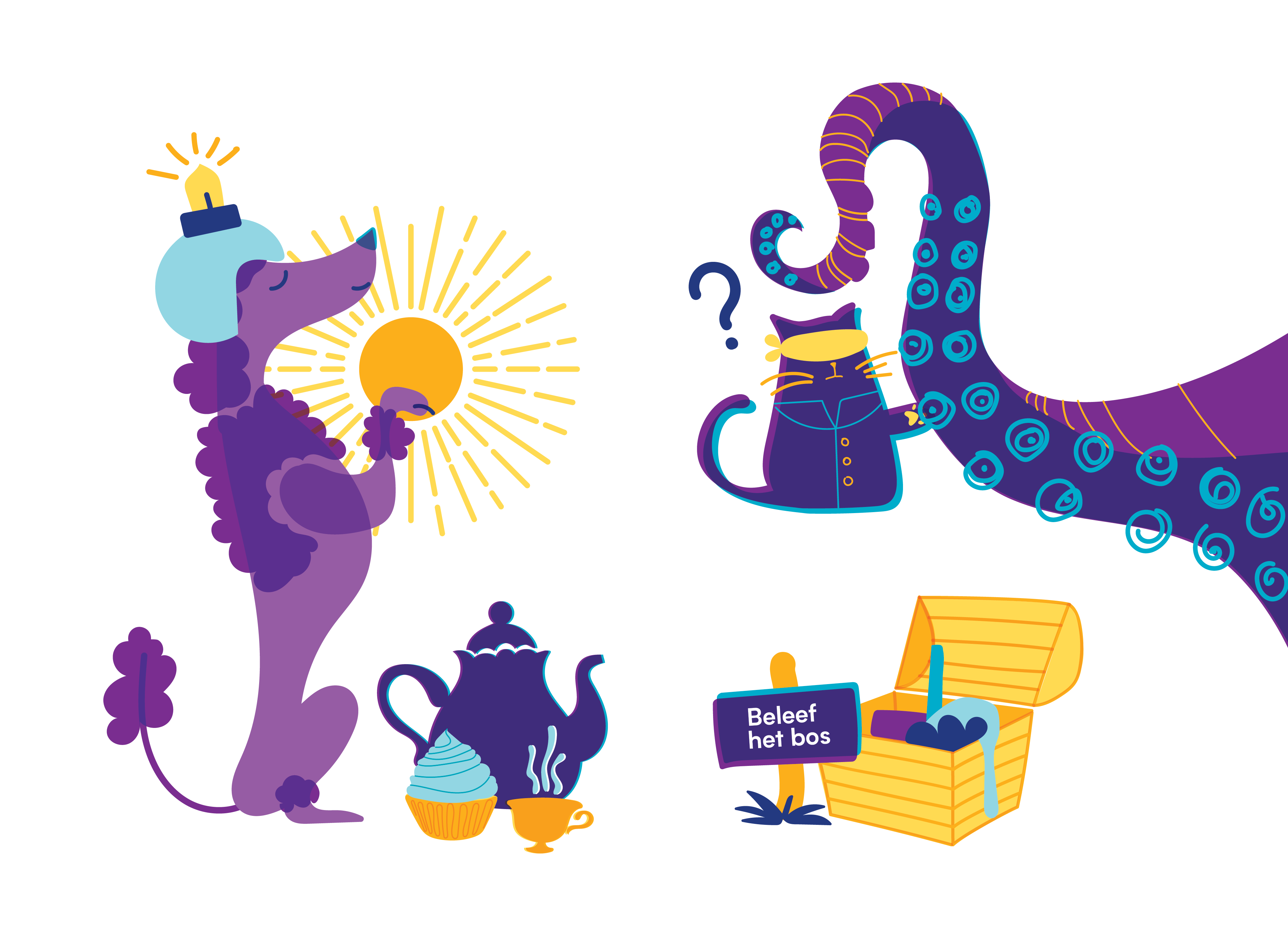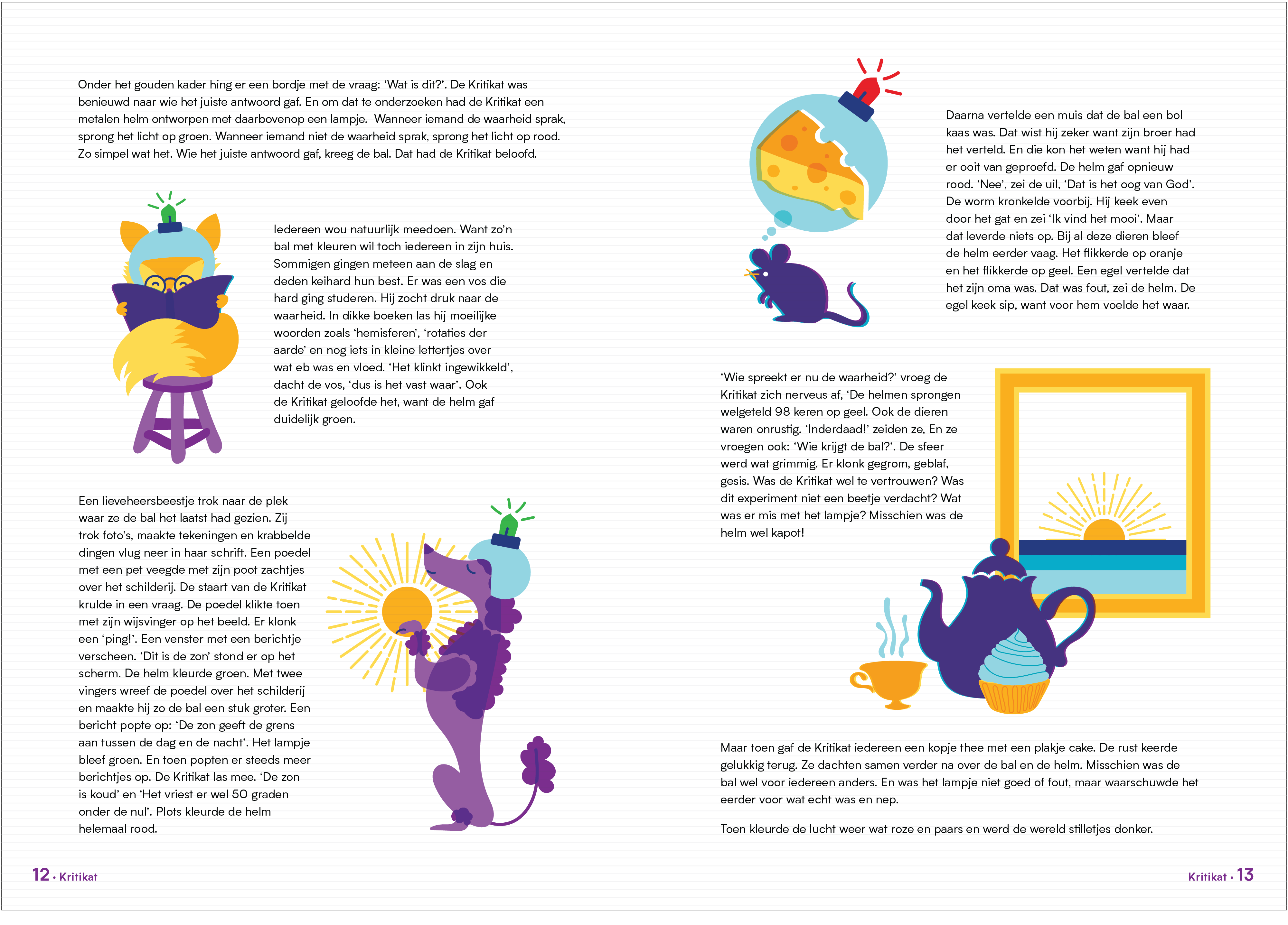 Naast de brochure voorzagen we ook de bijhorende denkverhalen en klasoefeningen van vrolijke illustraties. Deze illustraties werden groot afgebeeld op de introbladen van de verhalen zodat ze in de klas gepresenteerd kunnen worden.