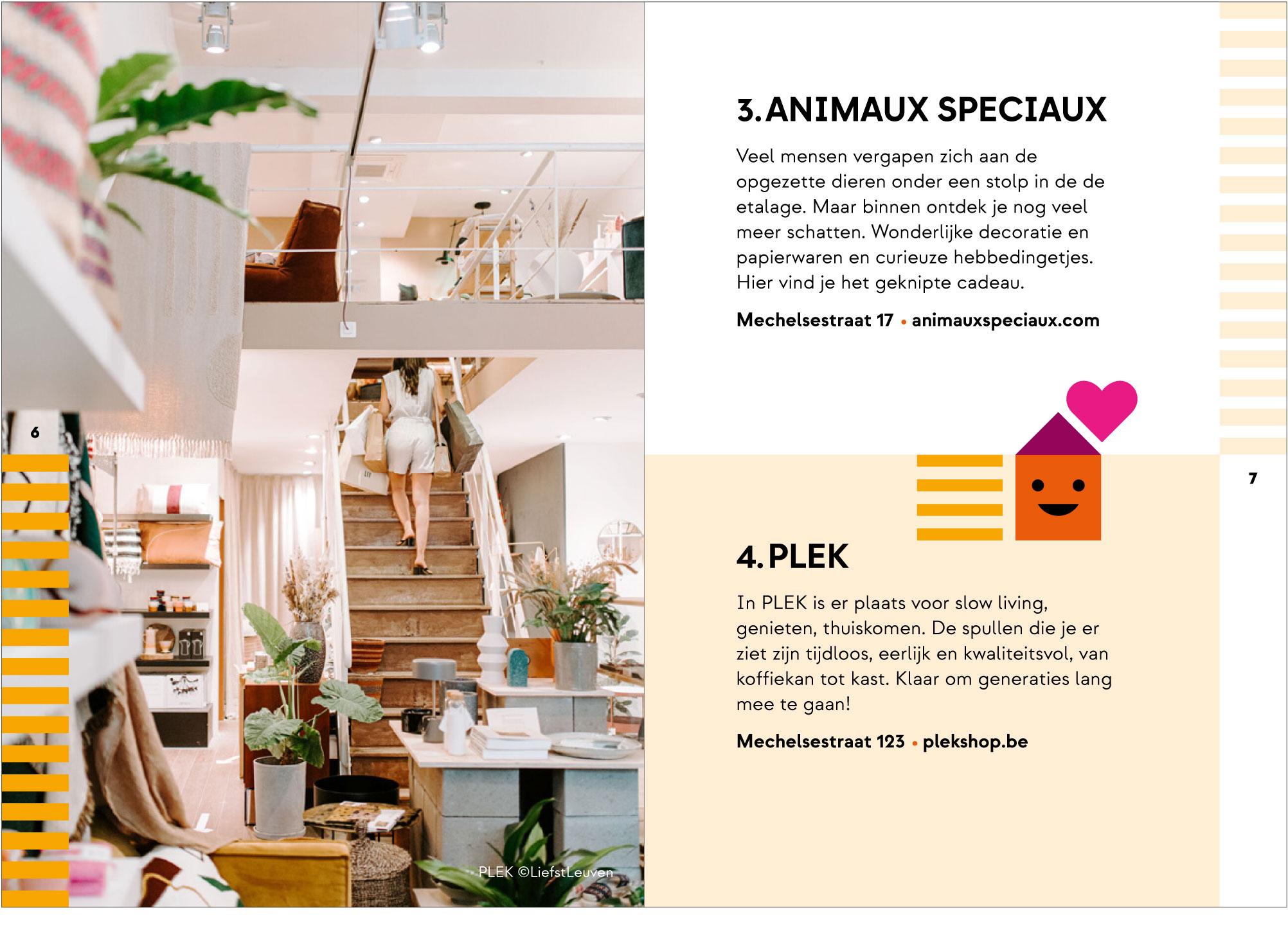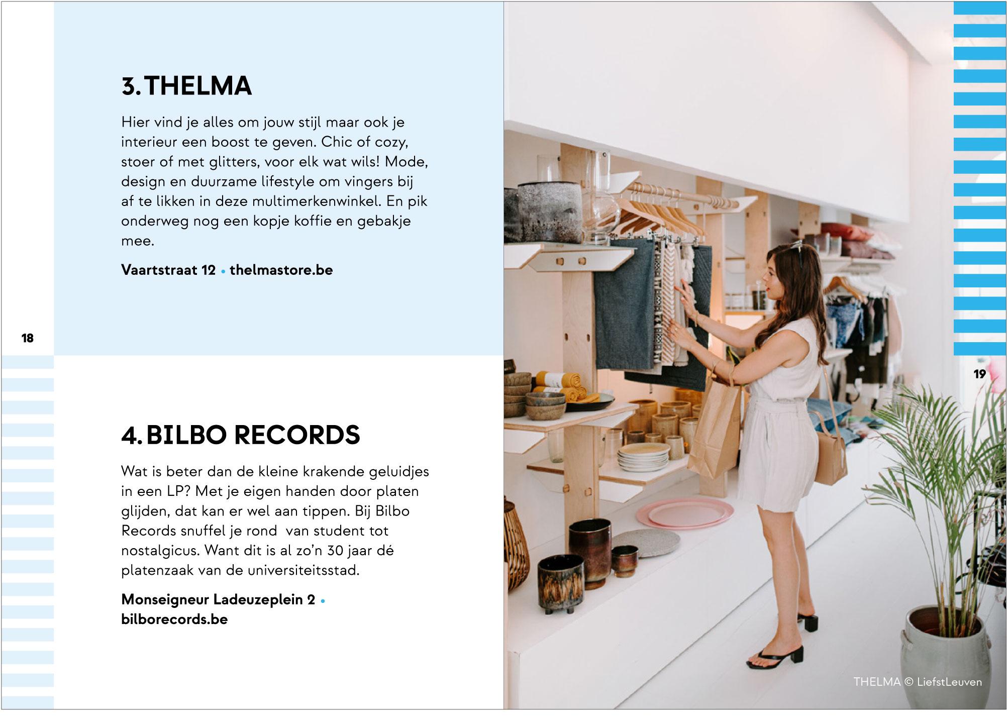 De winkels werden opgedeeld in 4 thema’s en elke thema kreeg een bijhorende kleur die werd doorgetrokken in de schutbladen, de randen van de pagina’s en in de locatiepins op de kaart.