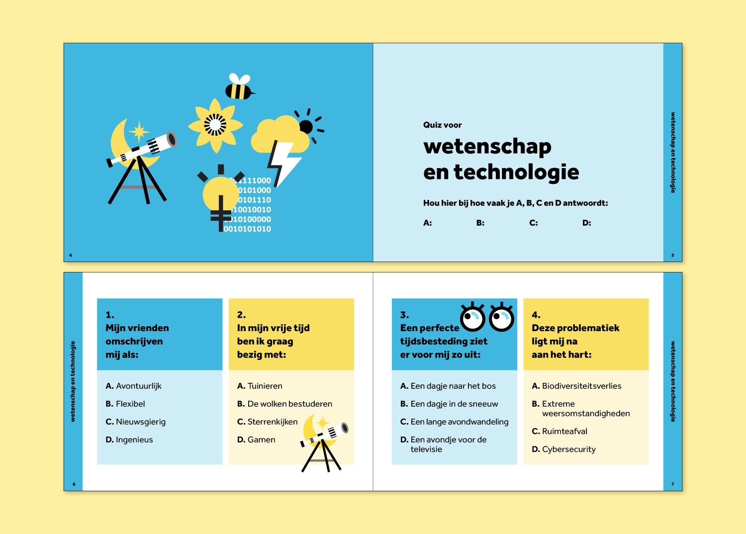 Maar daar stopten we niet. Naast de illustraties gaven we ook de volledige quiz vorm – zowel in een interactieve online versie als in een handig booklet. Met aan de ene kant de test over wetenschap en technologie, en aan de andere kant de test over cultuur en samenleving.