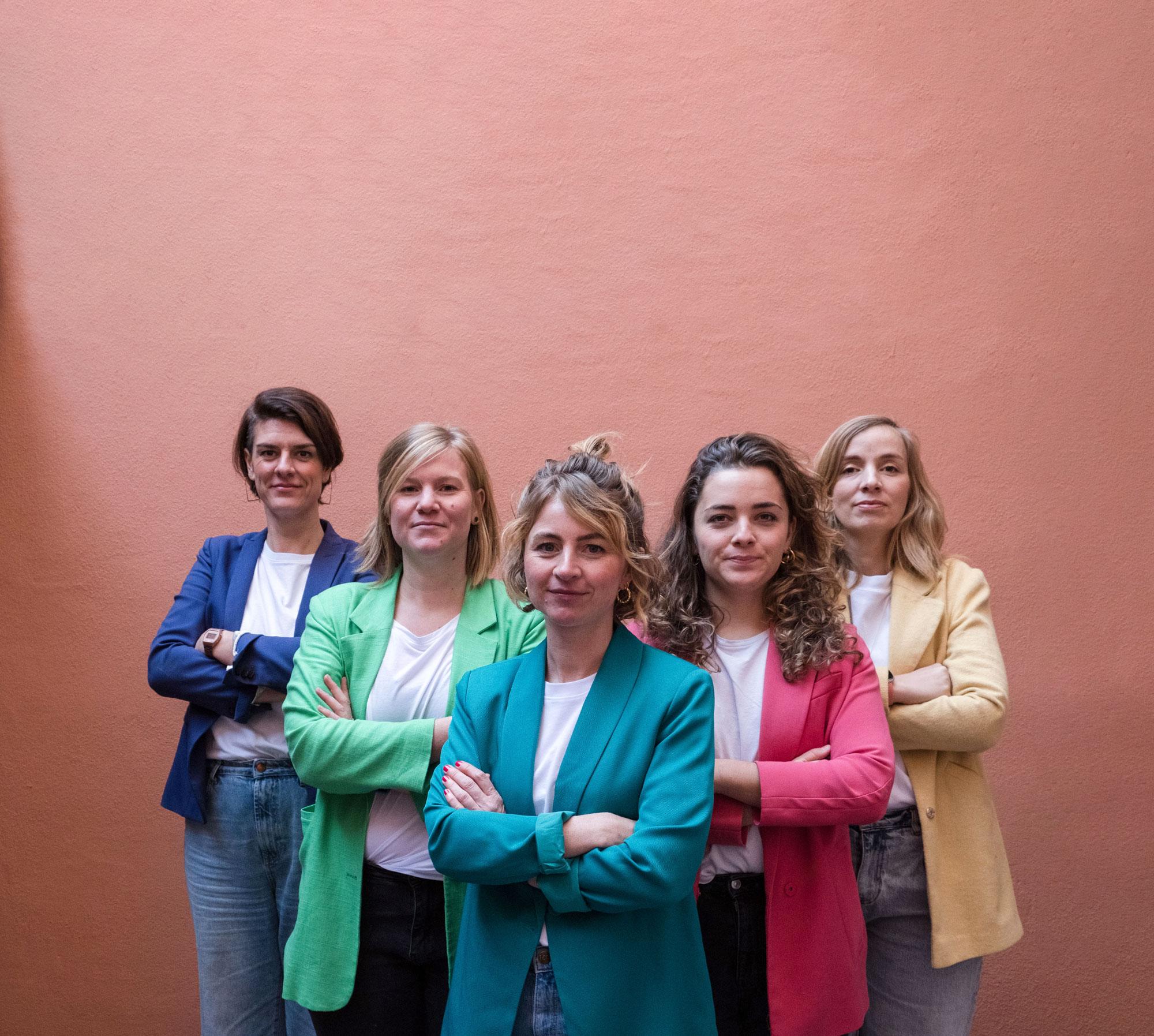 Van links naar rechts: Geertrui, onze rechterhand achter de schermen qua marketing & interne werking. Daarnaast Anneleen, art director & founder van Buro Knal, inzetbaar voor logo’s, illustraties en campagnebeelden. In the middle, Sofie, creative director en founder van Buro Knal, creëert met plezier jouw brochures, infographics en websites. Op plaats 4 en 5, Robin en Joke, grafische ontwerpers pur sang.