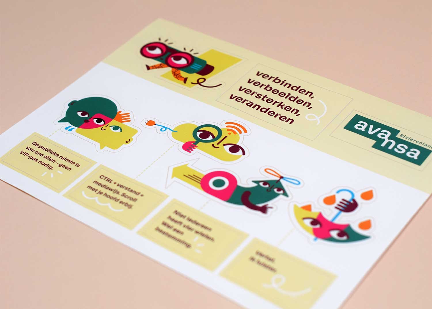 Samen kozen we ook voor een stickervel waarop de illustraties en waarden van Avansa worden herhaald. Die stickers reizen mee buiten het magazine en zorgen voor extra zichtbaarheid van de nieuwe beeldtaal.