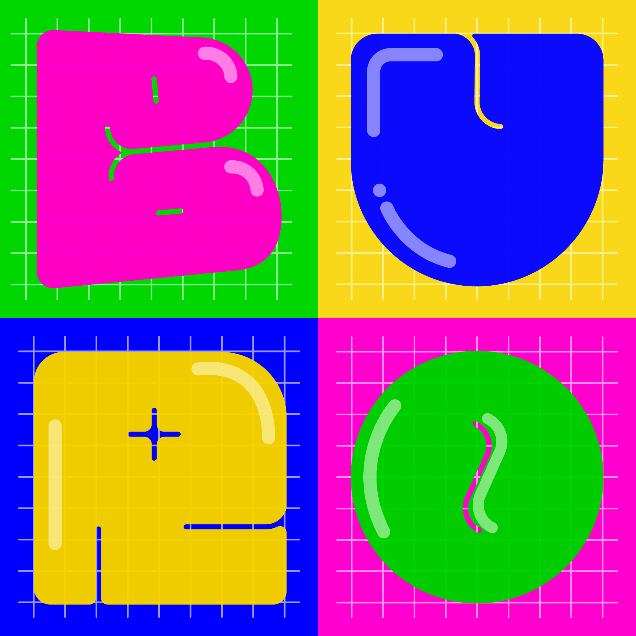 De basis van de letters is simpel en strak: een vierkant met witte lijnen. Nadien werd elke letter afgerond, vervormd, geroteerd… en van een knalkleur voorzien.