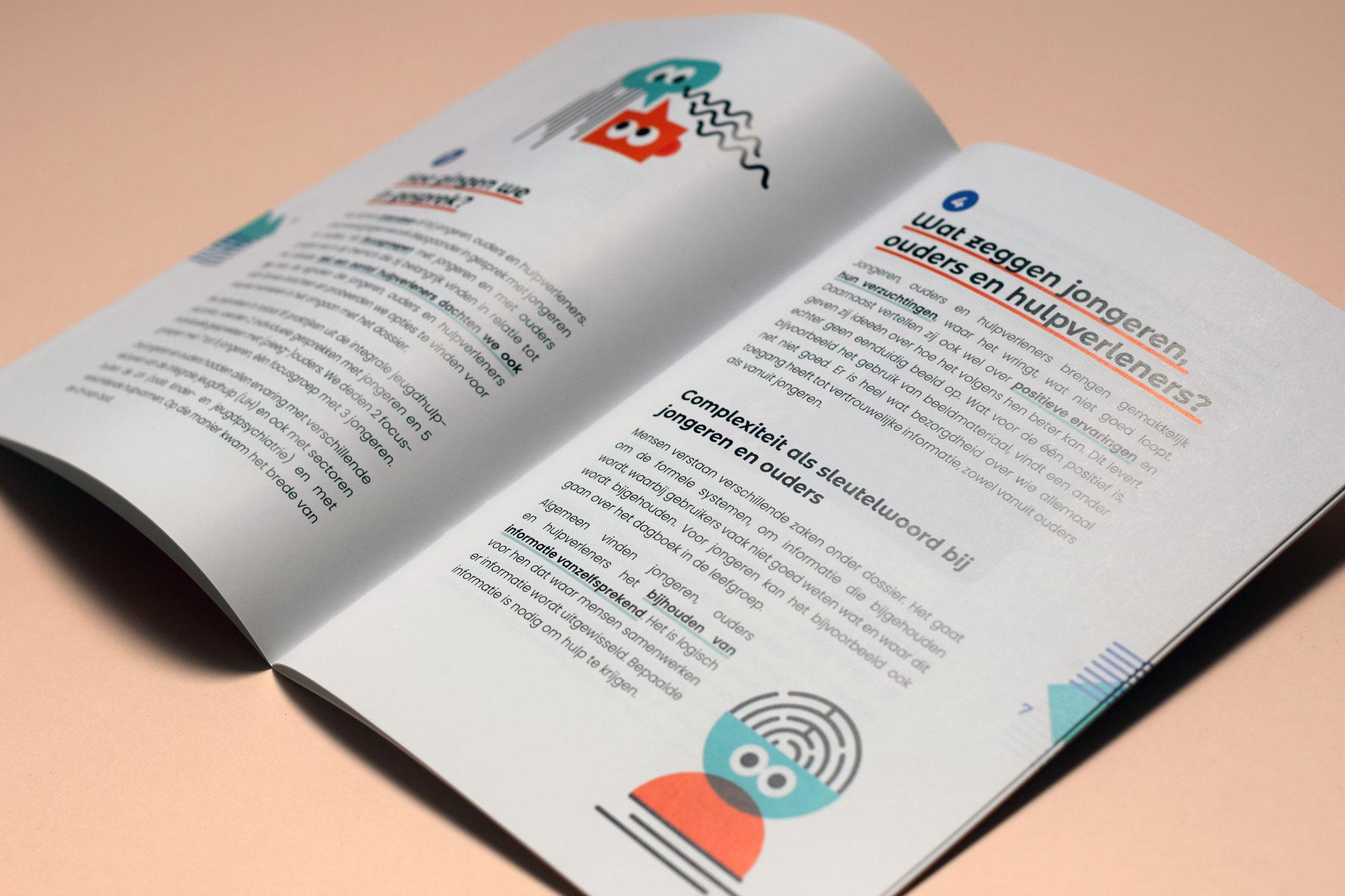 In plaats van gedetailleerde illustraties, kozen we voor abstracte figuren. Dit maakt het geheel tijdlozer en algemener. Gender, leeftijd en ras zijn niet van toepassing. We beelden thema’s als dialoog, participatie, vraagstelling, complexiteit, doelverschuiving, ongelijkheid en eigenaarschap uit aan de hand van abstracte vormen die tot leven komen. De iconen breken de tekst en maken de brochure toegankelijk, zonder het geheel kinderlijk te maken.